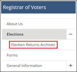 - Go to the Registrar of Voters website, SoCoVotes.com. Click on the “Elections” option near the top of the menu on the left, and then click on the “Election Returns Archives” sub-option that appears under “Elections” (see red rectangle below)